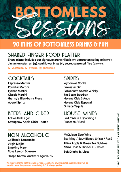 Each session is for 90 minutes and bookings are recommended. Minimum of 2 persons required for offer and everyone in your booking must be having the same bottomless offer.