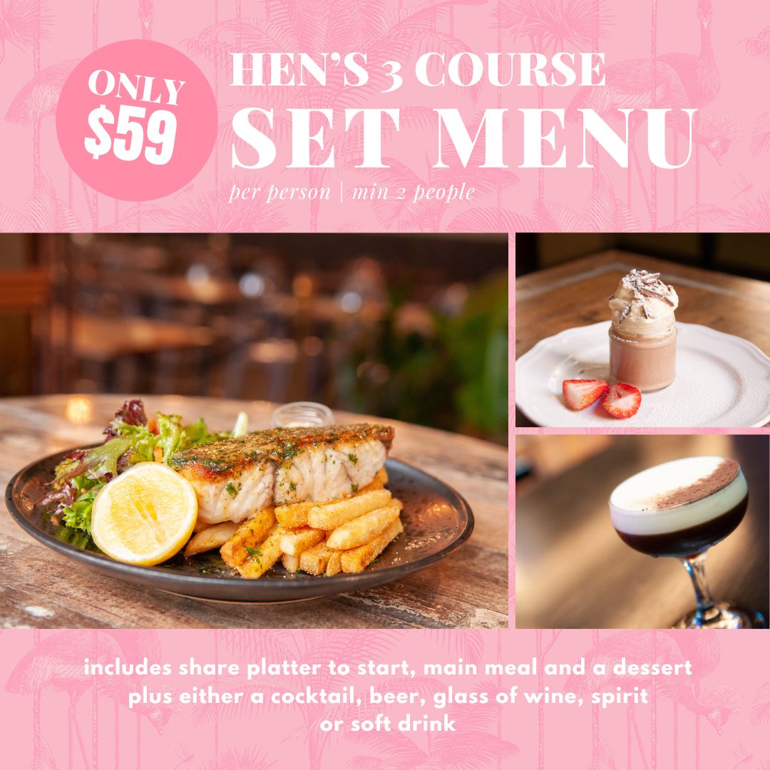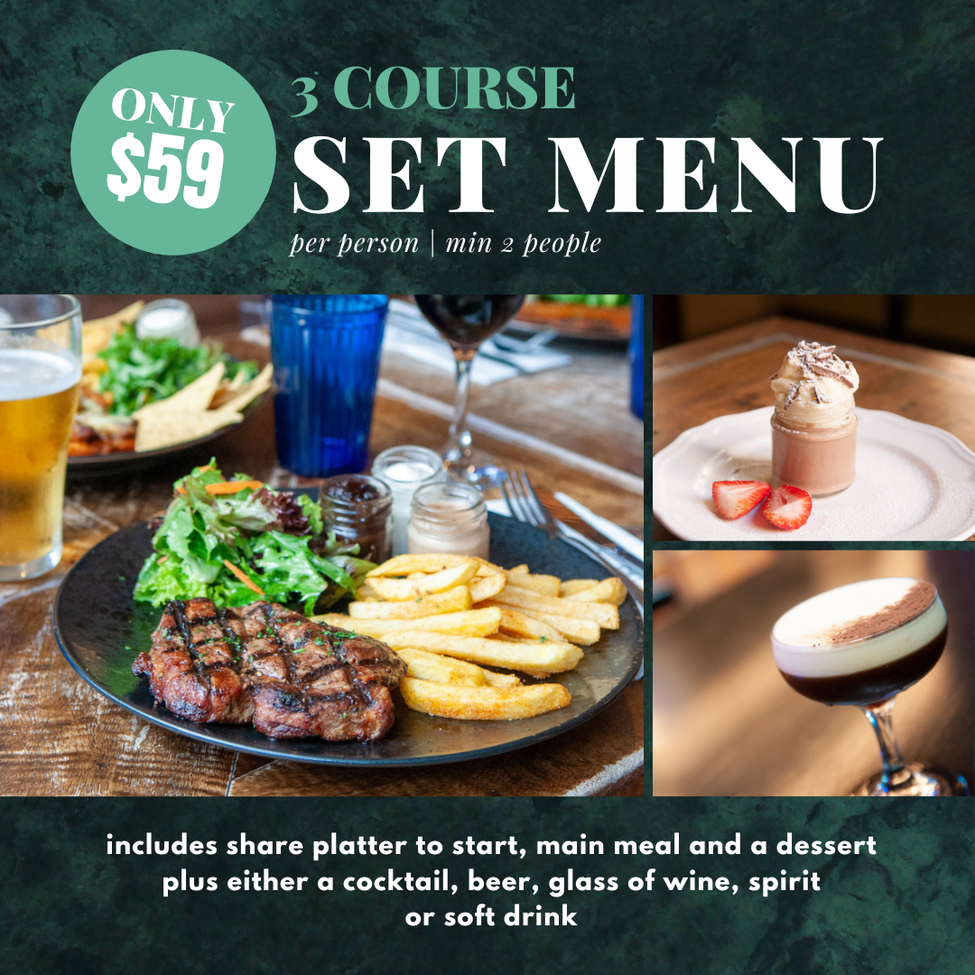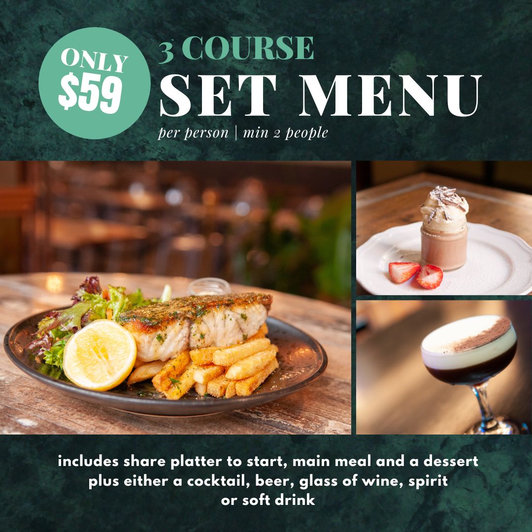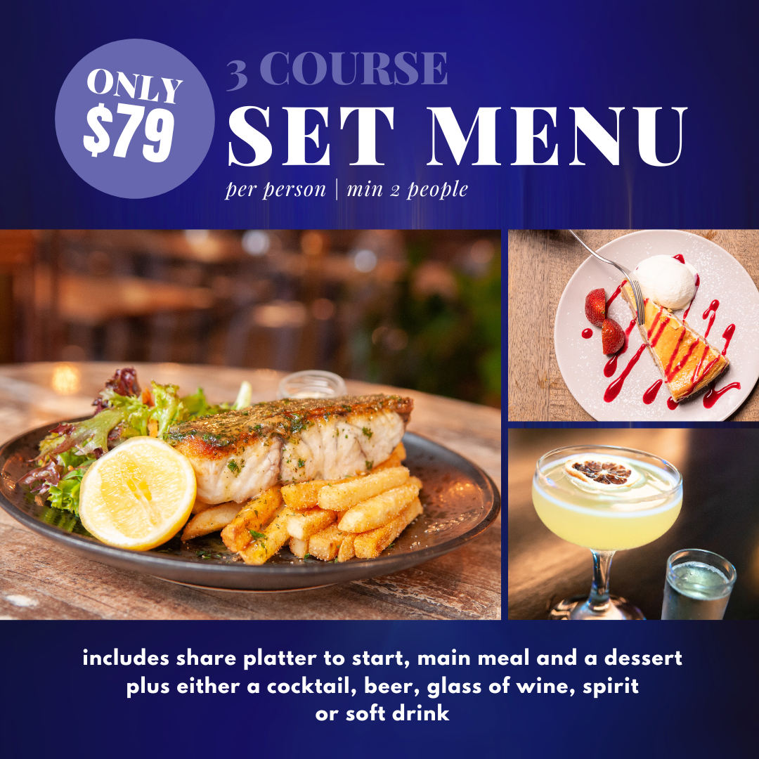 Includes a share platter, main meal and a dessert plus either a cocktail, beer, glass of wine, spirit or non-alcohic drink on arrival.